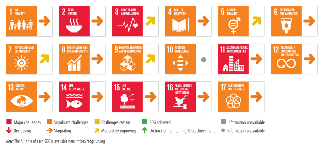 This figure shows the general overview of the world’s progress towards meeting the UN’s SDGs, showing that there is limited to no progress toward attaining the SDGs by 2030. The caveat is that although not much progress is being made with the world, many countries are making significant progress or have already met the goal, showing that certain countries are making considerable progress toward the SDGs even though progress is minimal when averaged out over all countries.